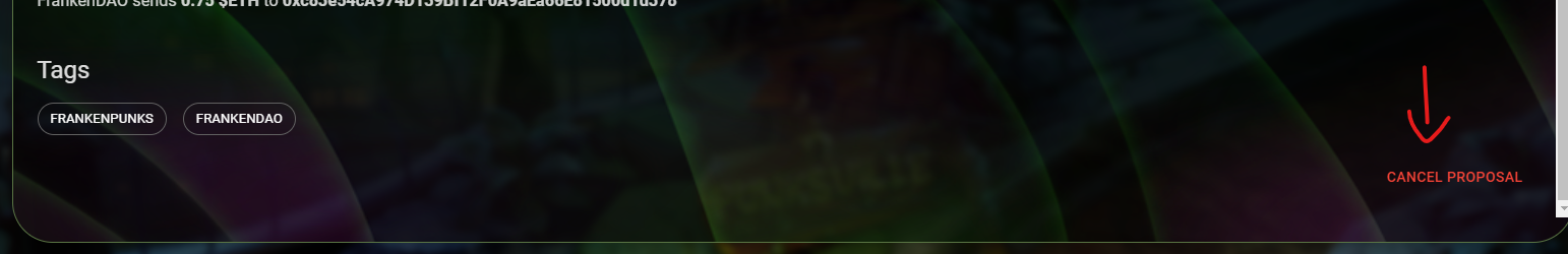 <figure><img src="https://2464856929-files.gitbook.io/~/files/v0/b/gitbook-x-prod.appspot.com/o/spaces%2FW1ytDTQmGbspOF584SEo%2Fuploads%2FlJcAUT0NcdGGchsT3CSN%2Fimage.png?alt=media&#x26;token=516d7bee-559b-4540-bb0e-0c5976e4a91a" alt=""><figcaption><p>Cancel Proposal Button at bottom of Proposal Modal</p></figcaption></figure>